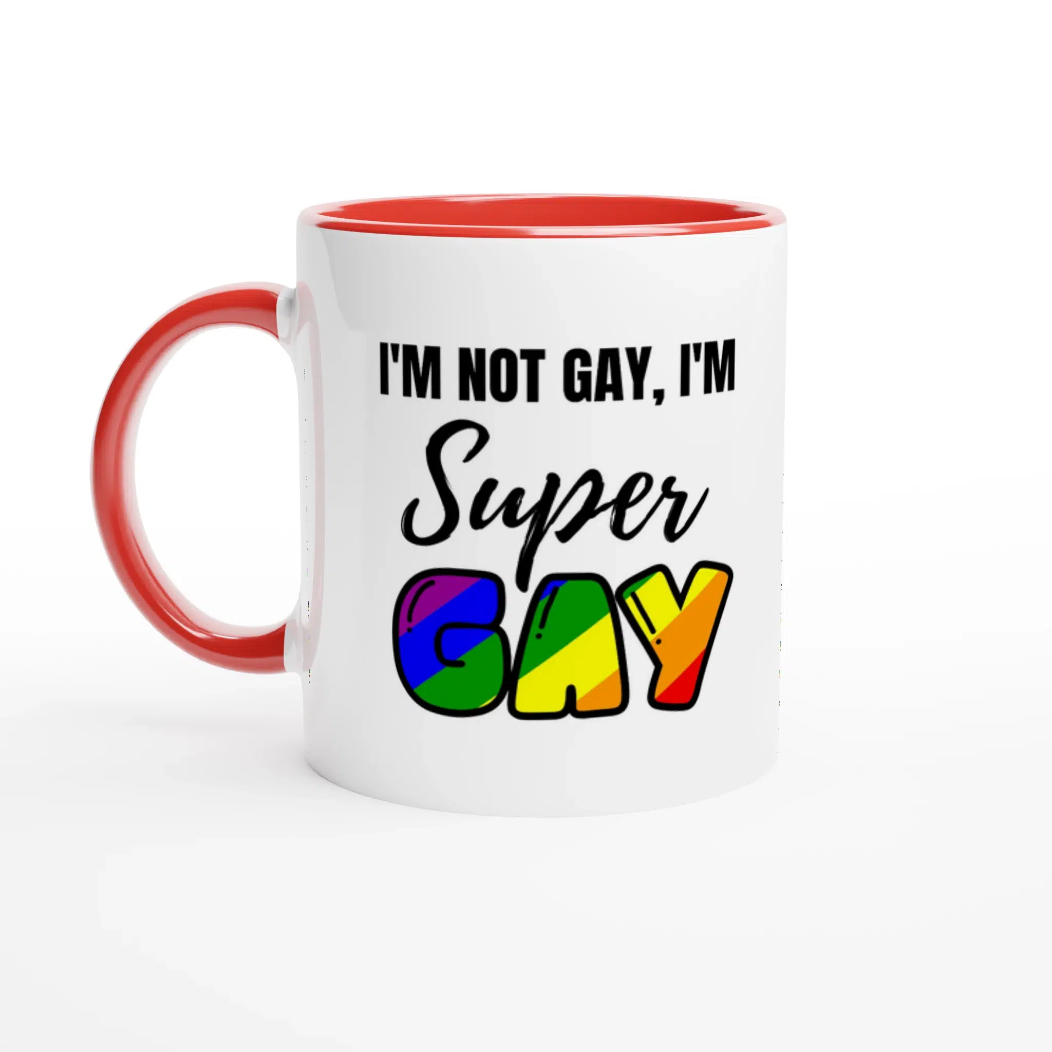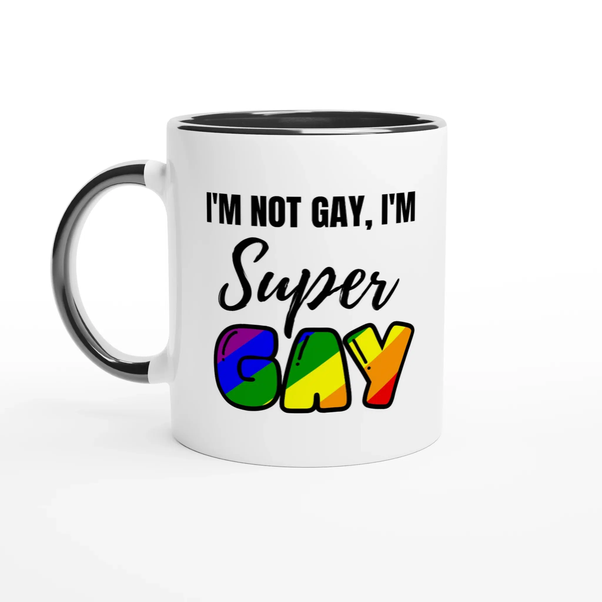 Want a mug that sparks conversation and shows your colors? The I’m Super Gay Ceramic Coffee Mug is a glossy 11oz ceramic cup with a vivid, full-coverage rainbow print on a bright white print area. Choose optional colored rim, inside, and handle details to match your style.