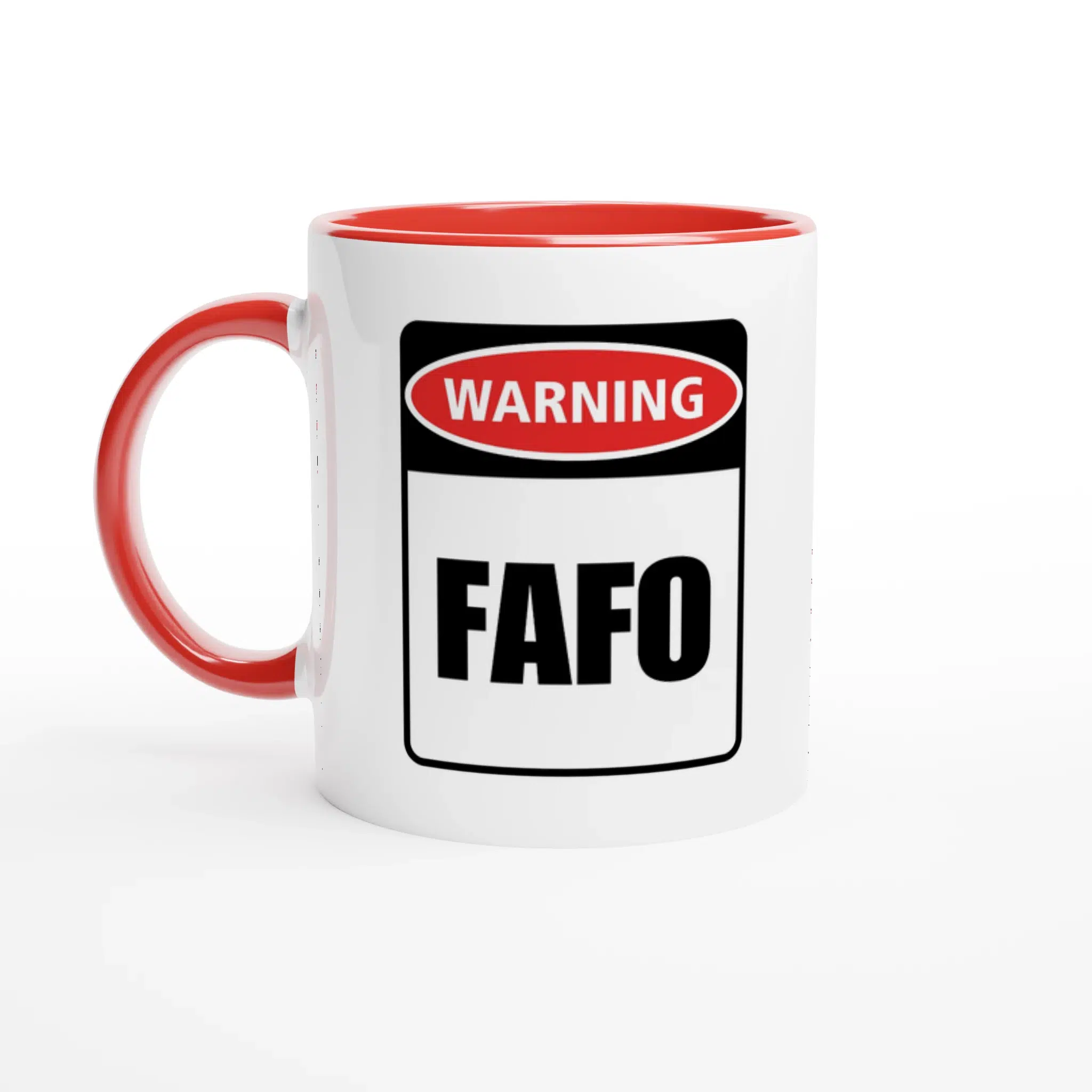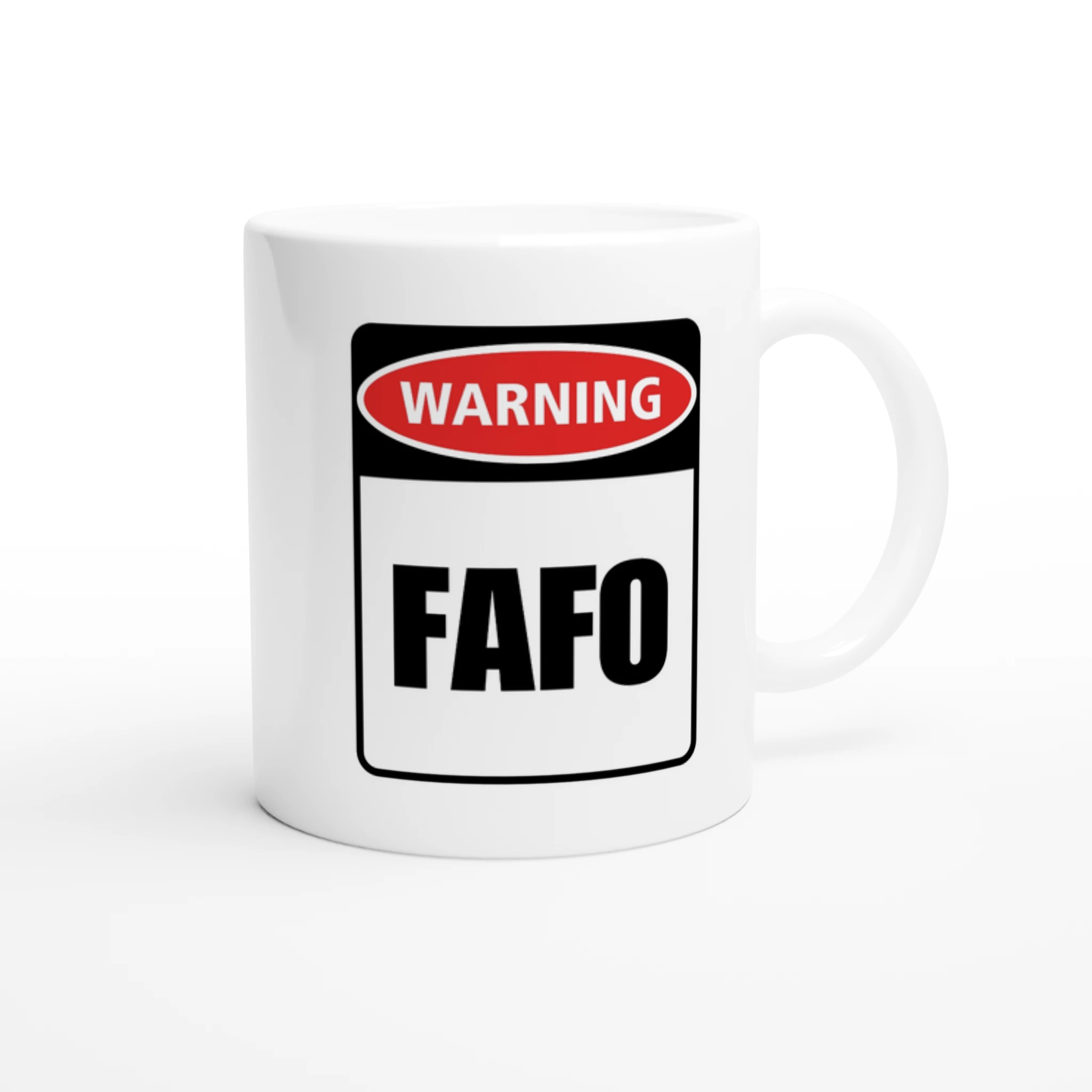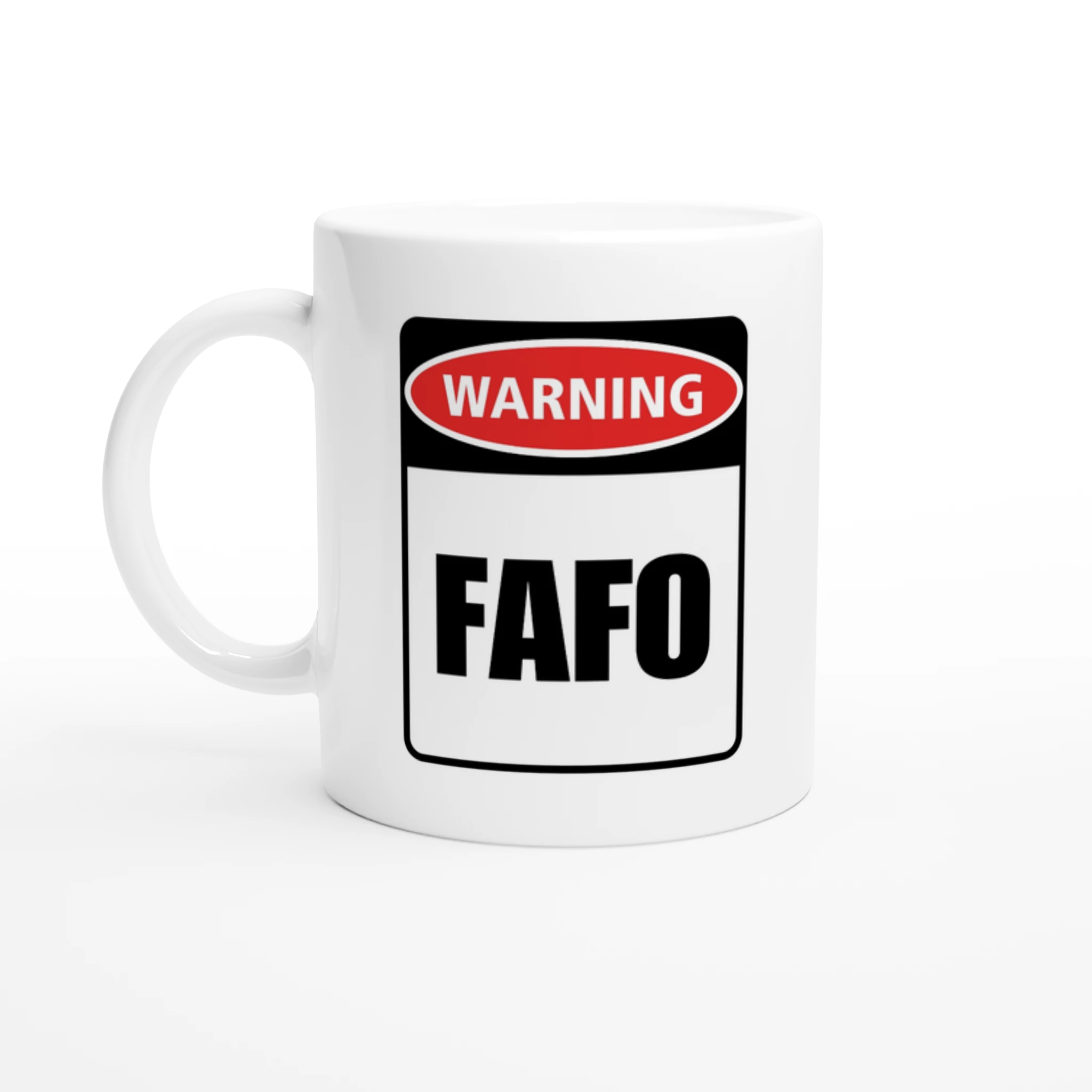 Introducing the perfect blend of humor and function, our Warning – FAFO (pronounced Fay-fo) mug! This eye-catching 11oz ceramic cup is designed to spark conversation and maybe a chuckle or two. With its glossy white finish accented by a vibrant optional colored rim, inside, and handle, it’s not just a mug—it’s a statement piece for your kitchen or office, and it’s part of our Warning Sign series.